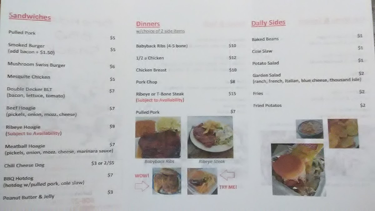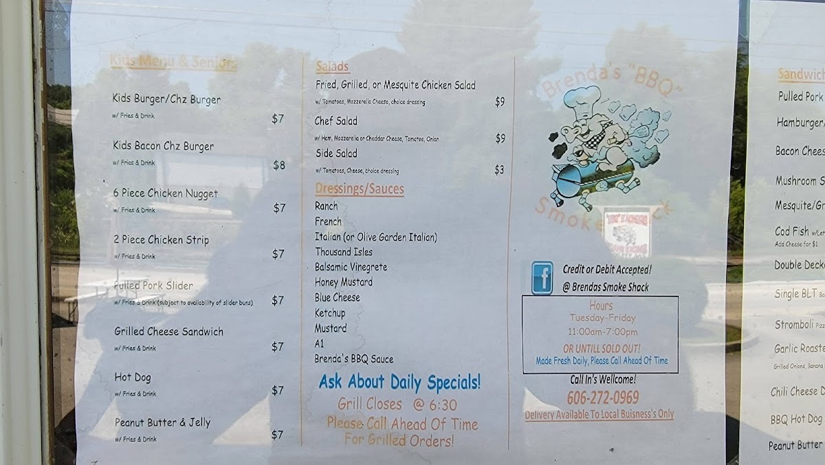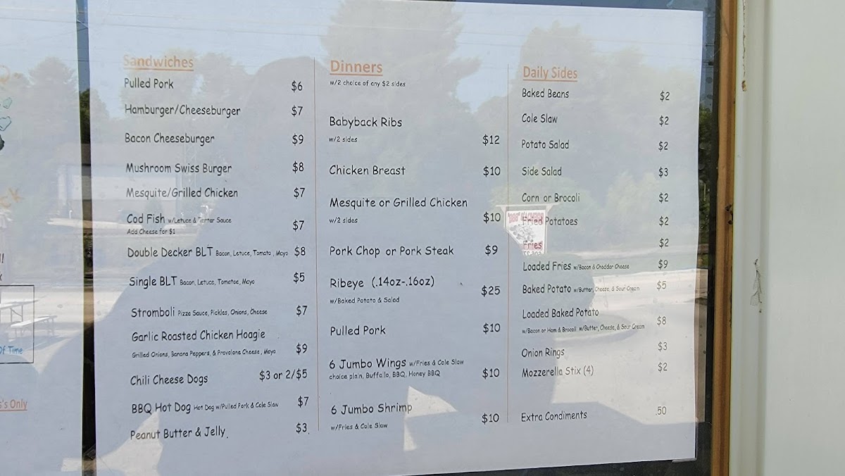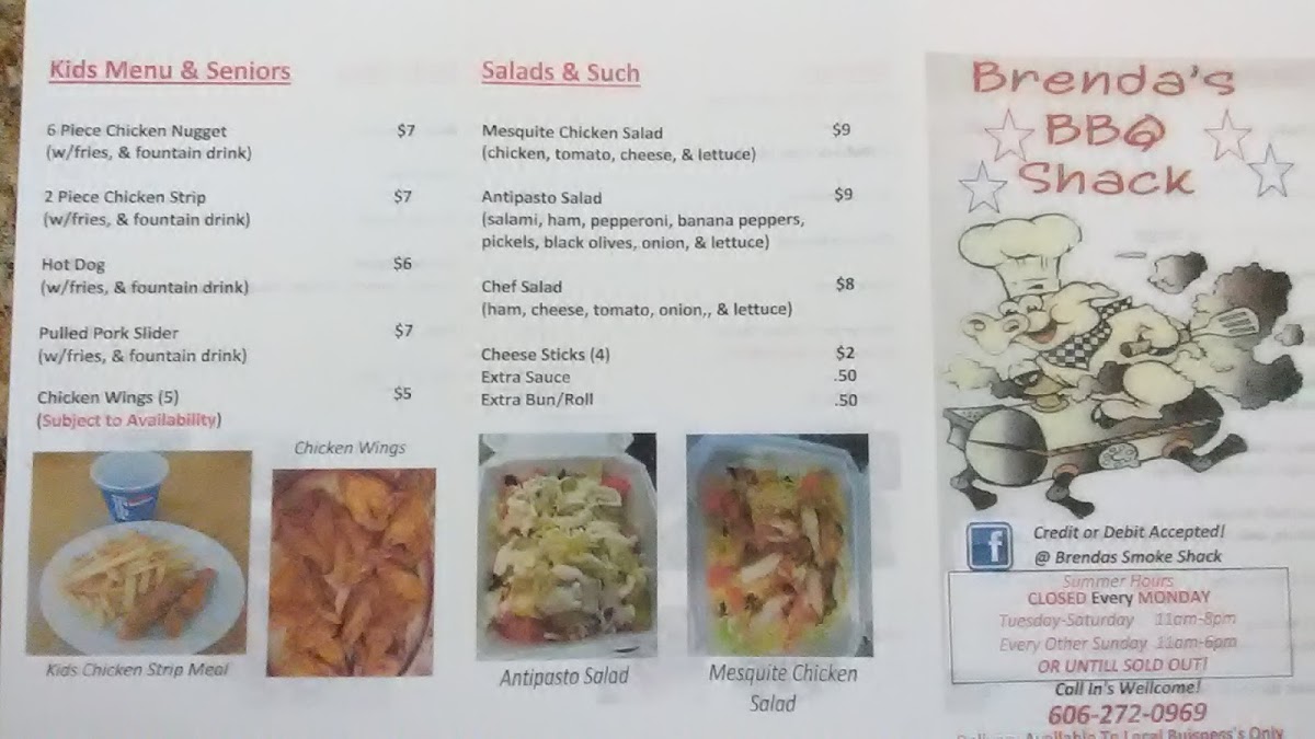 Brenda's BBQ Smoke Shack offers a varied and delicious menu, catering to all tastes with options for both kids and adults. For the younger diners, the Kids Burger/Chz Burger and Kids Bacon Chz Burger are favorites, alongside crispy 6 Piece Chicken Nuggets and Grilled Cheese Sandwich. The adult menu features a range of savory options, including the tender Pulled Pork Sandwich and hearty Bacon Cheeseburger. For a more flavorful experience, try the Mushroom Swiss Burger or the Mesquite Chicken Sandwich. The restaurant also serves a variety of satisfying dinner options like Babyback Ribs, Ribeye or T-Bone Steaks, and the juicy Grilled Chicken Breast. On the side, enjoy comforting classics such as Baked Beans, Cole Slaw, and Potato Salad. For those looking for something a little different, the Smoked Meatloaf special is a must-try. Salads like the Mesquite Chicken Salad and Chef Salad offer a lighter, yet flavorful, alternative to the heartier dishes. Daily specials keep the menu fresh, and with items like Stromboli Pizza and Cheese Sticks, there’s always something new to try. Whether you're craving something familiar or exploring new flavors, Brenda’s BBQ Smoke Shack has something to satisfy every appetite.
